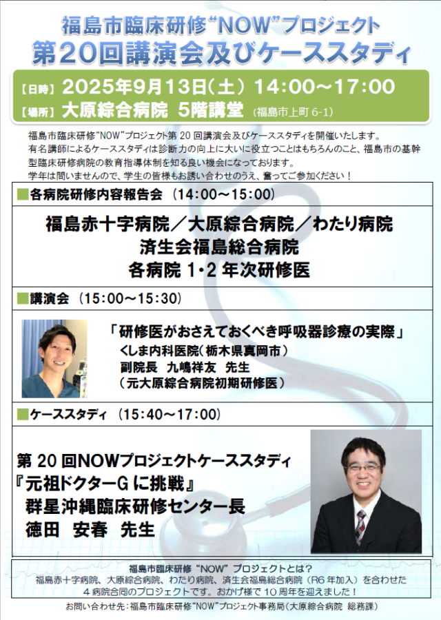 令和7年9月13日(土)午後2時より大原綜合病院講堂において、福島市臨床研修“NOW”プロジェクト第20回ケーススタディ・講演会が開催され、“NOW”プロジェクト4病院の研修医32名、各臨床研修病院の指導医・事務担当者が参加しました。